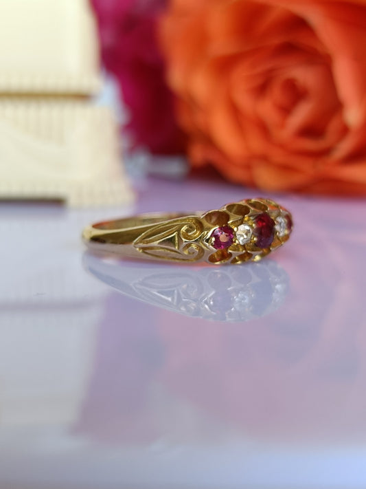 Antique Edwardian 1900c 18ct Yellow Gold Ruby & Diamond Boat Ring Sz 5 1/2 Or K